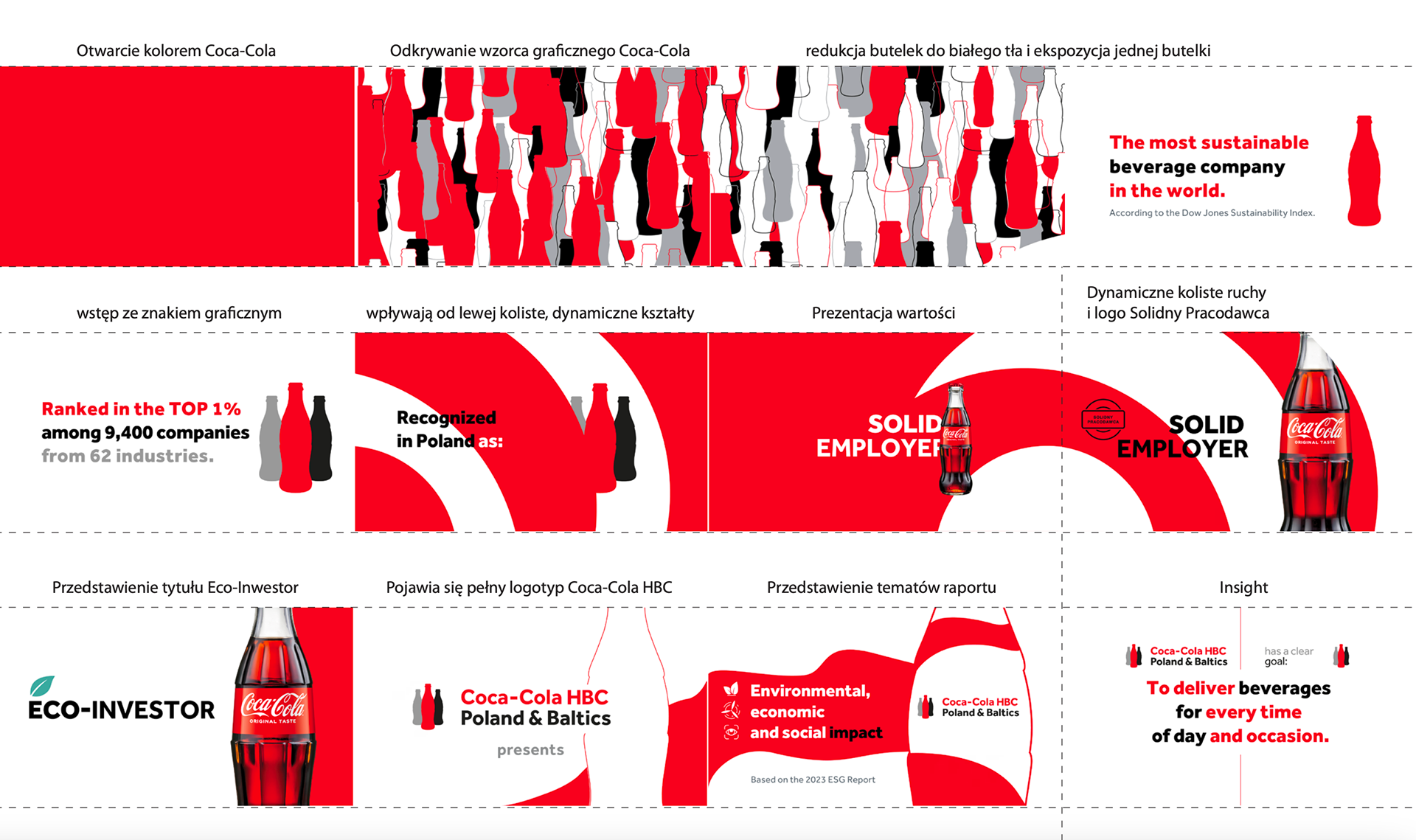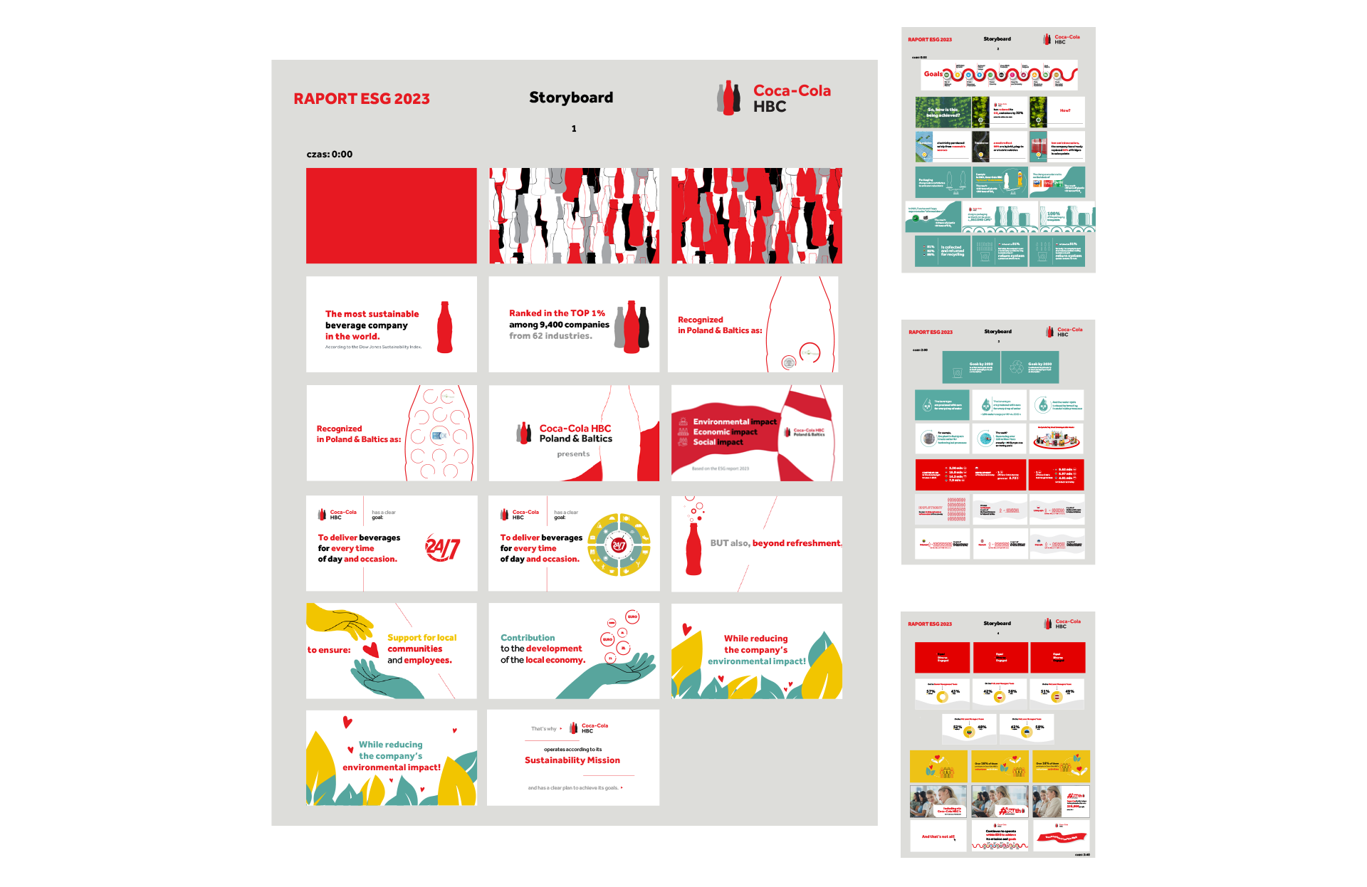 Rozwiązanie (Tłumaczenie): Moim zadaniem było wydobycie z raportu jego narracyjnego sedna. Każdy kluczowy wskaźnik – od redukcji emisji CO2 po procent recyklingowanego plastiku – przetłumaczyłam na prostą, symboliczną metaforę wizualną zamiast skomplikowanych wykresów. Zastosowałam uniwersalny język wizualny Coca-Cola.