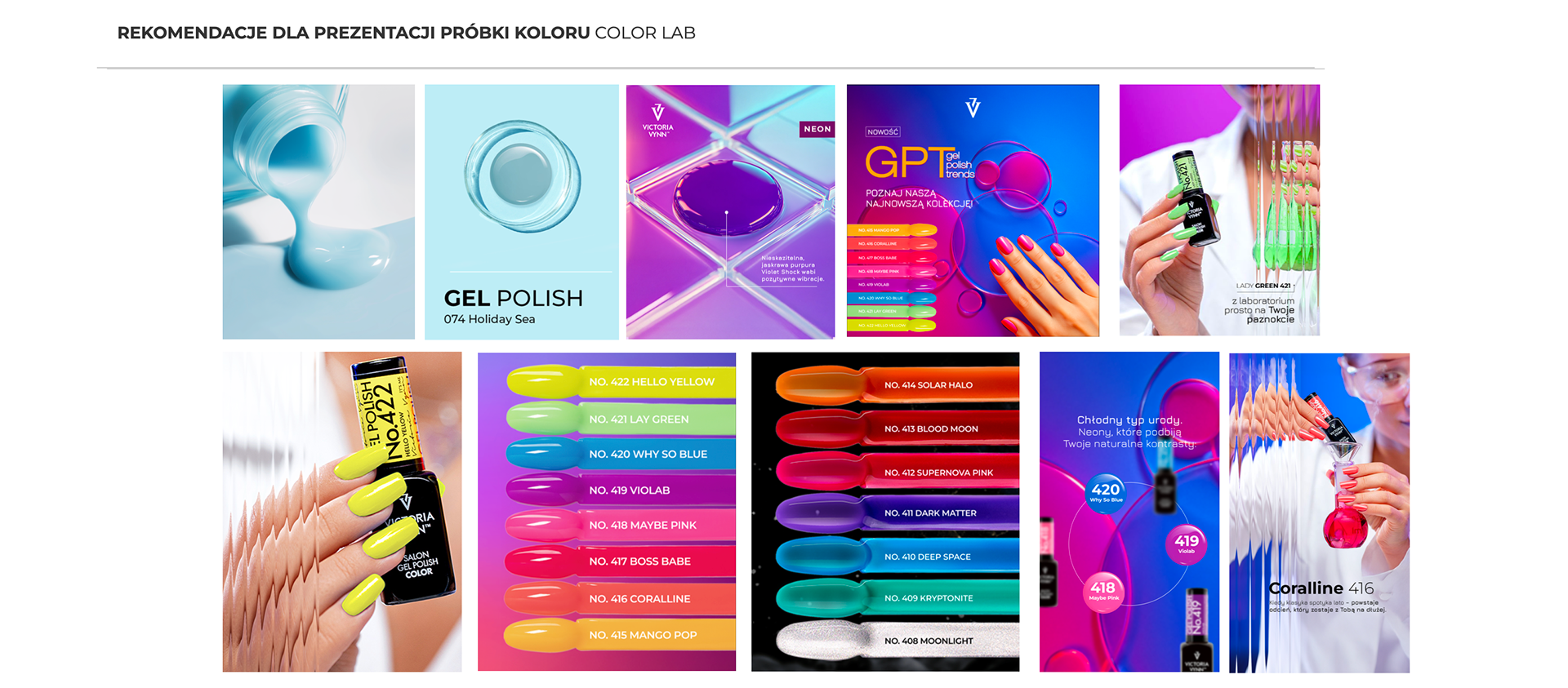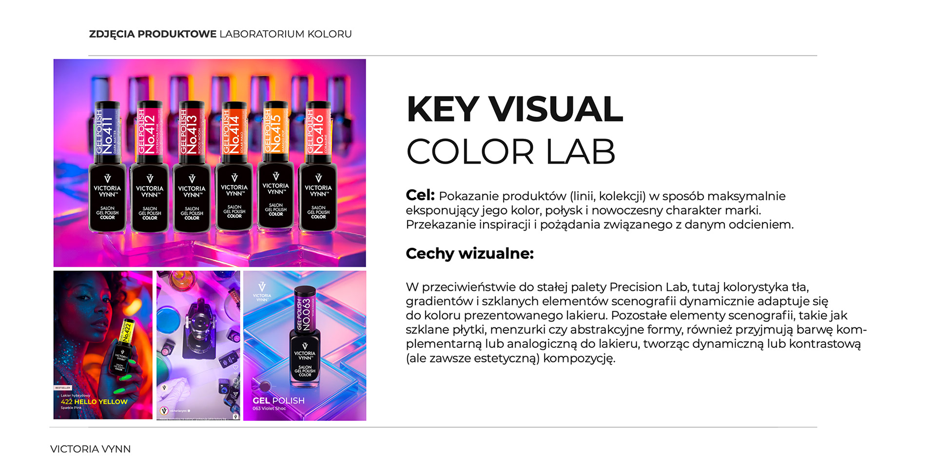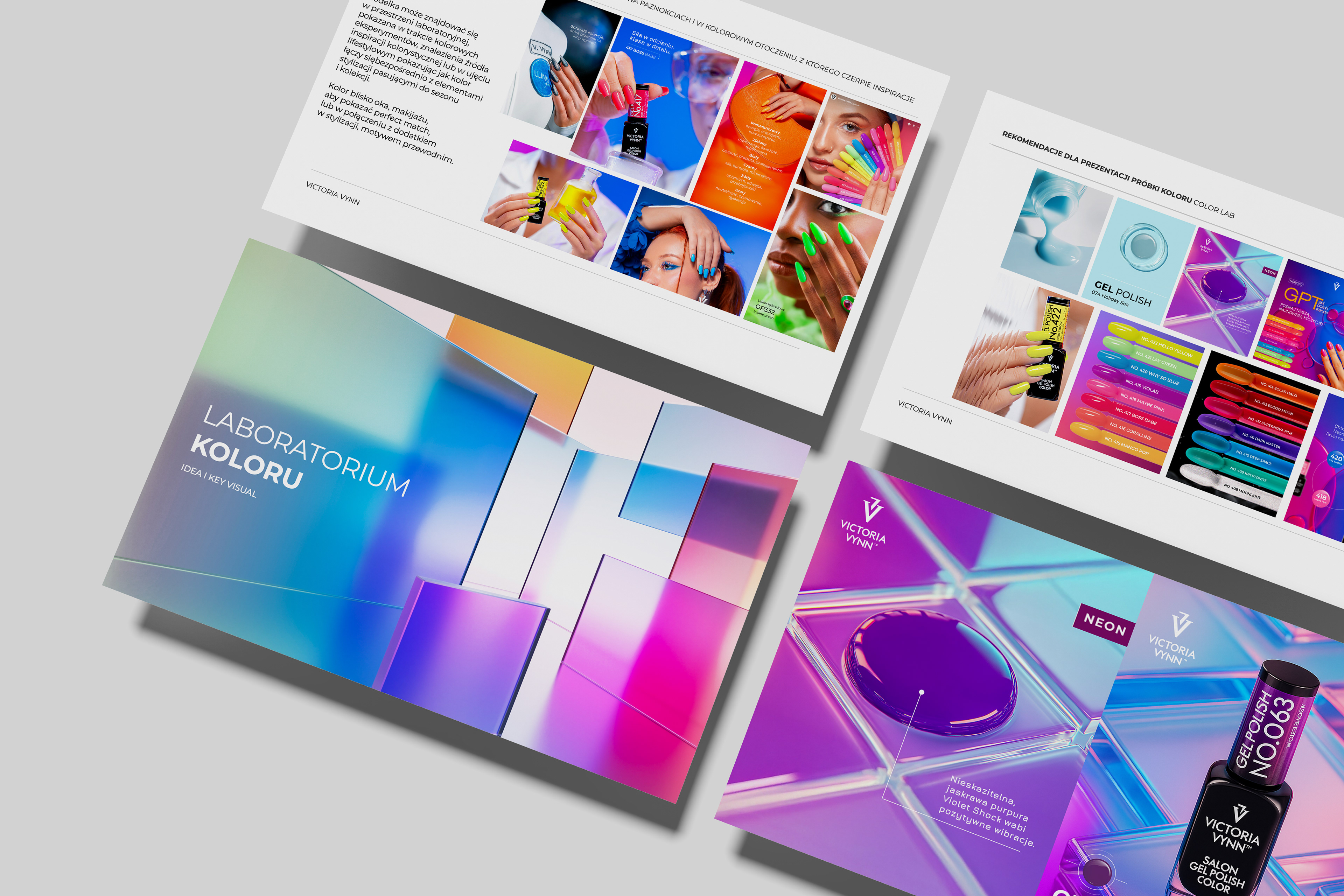 Zakres projektu: Nazwa, Tone of voice i master layout dla Kolorowego Laboratorium Stylistek Paznokci: maksymalne wyeksponowanie koloru, połysku i nowoczesnego charakteru produktów kolorowych (lakierów hybrydowych), pobudzenie wyobraźni i pożądania. Estetyka dynamicznej przestrzeni, gdzie naukowa metodyka spotyka się z bogactwem barw, a precyzja służy wydobyciu esencji koloru.